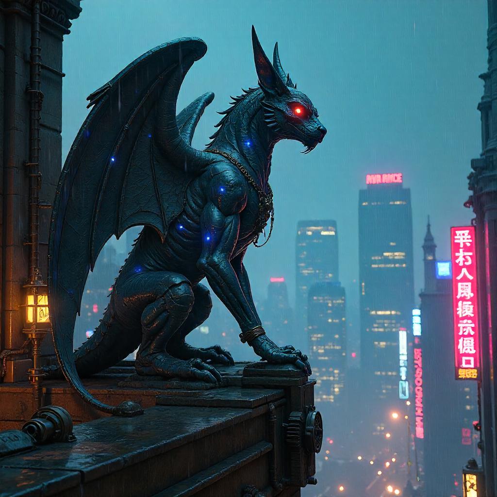 An ancient gargoyle brought to life in a neon-drenched cyberpunk city, perched on a rain-slick neo-Gothic cathedral. The stone creature is cracked but glows with blue runes; chrome plating covers its wings and its eyes burn with neon light. It stands beside a futuristic time machine: brass gears, copper tubing, plasma coils, and a spiraling portal that hums with chrono-energy. The backdrop is crowded with neon signs, holograms, and steam in a rain-filled night sky. Cinematic, ultra-detailed concept art with moody lighting, high contrast, and reflections on wet surfaces. Shot from a low angle to emphasize the gargoyle’s massive, watchful presence as it prepares to travel through time.