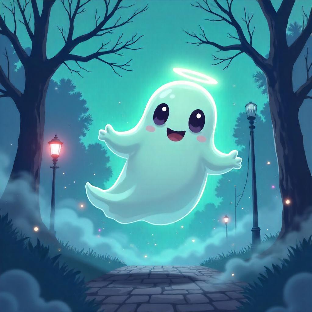 A friendly specter in a cartoon style floats through a dense fog. Soft, rounded ghost with a translucent body and a bright halo glow. Big round eyes and a cheeky grin. The fog swirls around in waves, obscuring distant silhouettes of trees and streetlamps. Palette of pastel blues, purples, and mint greens with bold black cartoon outlines. Diffuse, ethereal lighting with a gentle glow around the ghost. Composition: mid-shot, slightly from below, giving the specter a playful float. Add sparkles and specks of fog to enhance the atmosphere. Whimsical yet spooky, suitable for all ages.