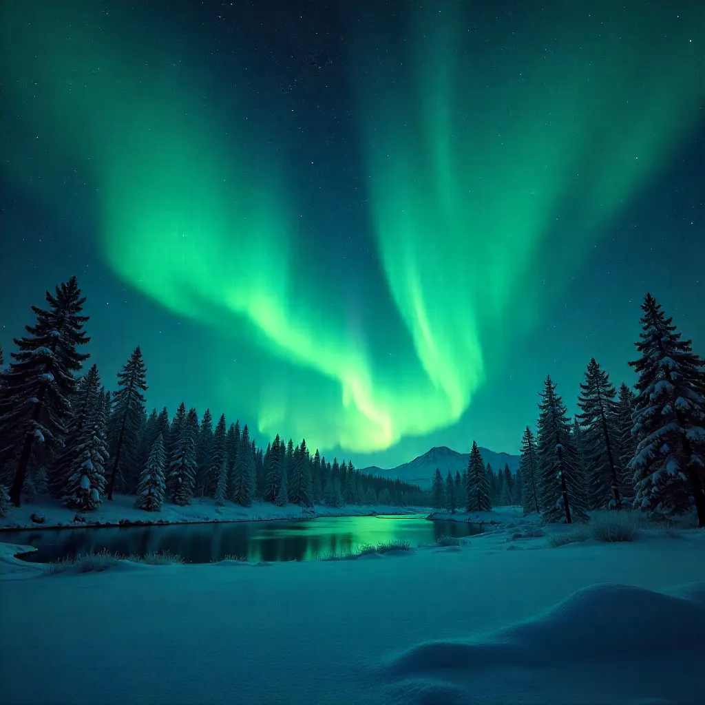 Ultra-detailed photorealistic night landscape of a mesmerizing northern lights display illuminating a starry sky above a dense forest. Emerald and emerald-green curtains of aurora sweep across the horizon with hints of violet and blue, rippling and shimmering. The forest below is a dark silhouette of tall evergreen trees under a powdery snow ground. A calm lake or clearing reflects the aurora and the starlight, creating a tranquil glow. The sky is filled with bright stars, with a faint Milky Way band visible. The scene is cinematic, captured with a wide-angle lens, 8K resolution, high dynamic range, cool color palette, crisp details in shadows and highlights, and a serene, otherworldly mood.