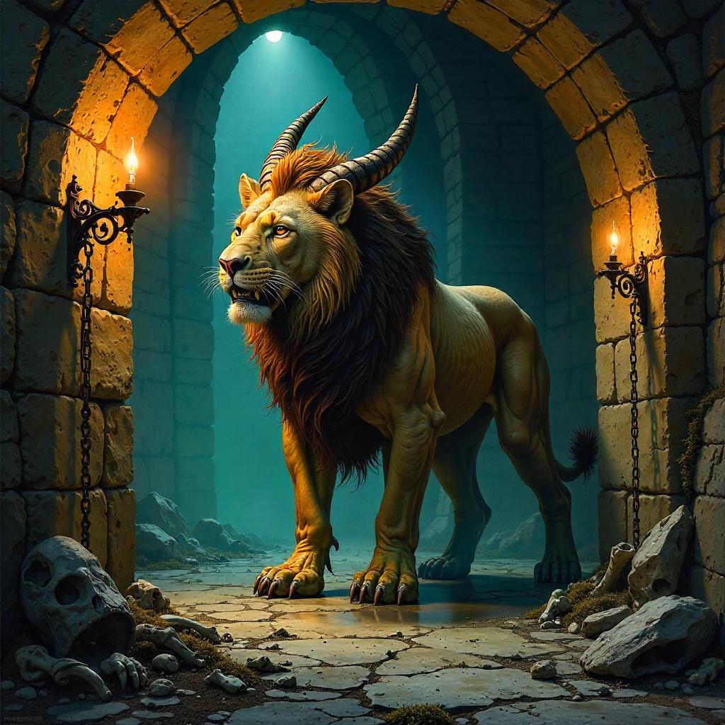 An imposing three-headed chimera (lion head in the foreground, goat head rising from its back, and a serpentine tail) stands in a damp castle dungeon. Rendered as a thick oil painting on canvas with visible brushstrokes and heavy impasto. Low, cinematic perspective looking up at the creature to heighten menace. Flickering torchlight from wrought-iron sconces casts warm amber highlights and deep blue shadows across rough cut stone walls, an arched ceiling, iron bars, and rusted chains. The dungeon floor is damp and mossy, with a few scattered bones hinting at forgotten battles. The chimera’s fur, scales, and eyes are meticulously textured, conveying power and ancient intellect. Color palette of ochre, burnt umber, ivory, slate gray, and subtle emerald greens from mold. A mood of ancient myth, dark fantasy, and Romantic/Baroque drama, with dramatic chiaroscuro and painterly surface.”