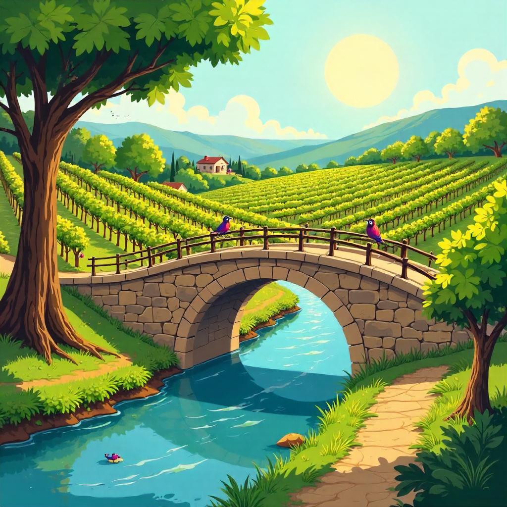 Cartoon-style illustration of a small stone arched bridge crossing a gentle creek in a sunlit vineyard. Rows of grapevines on rolling hills with bright green leaves, wooden trellises, and clusters of grapes. The bridge features exaggerated, friendly lines, bold black outlines, and simple shading in vibrant, flat colors. The scene is playful and serene: a few birds perched on the bridge rail, a cheerful sun in a clear blue sky, distant farmhouse or village, and maybe a farmer strolling along a vine-lined path. Soft golden light, long shadows, and a wide horizontal composition that draws the eye toward the bridge and distant hills. Style: cartoon, cel-shaded/vector-like with clean shapes and minimal fine detail.
