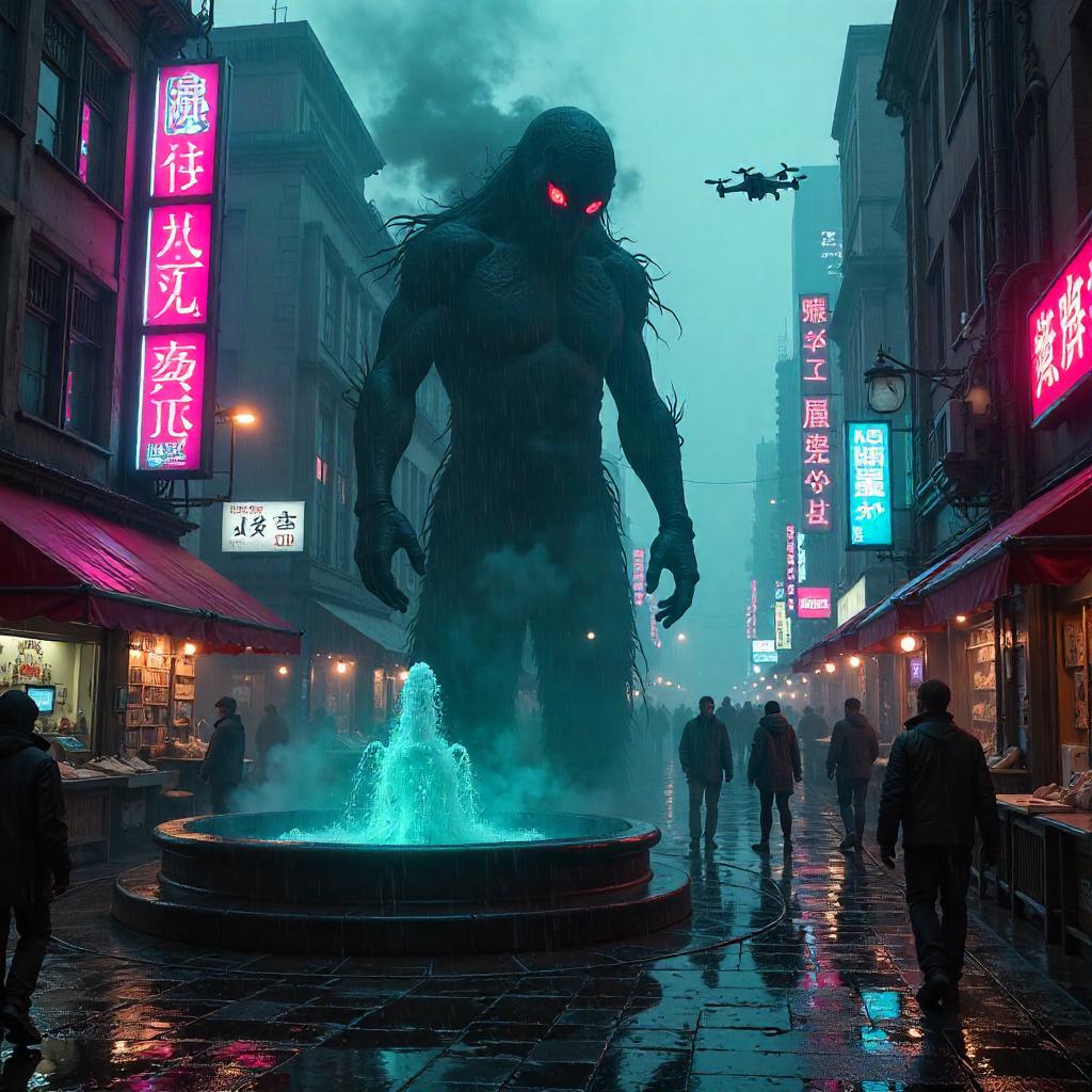 In a rain-soaked cyberpunk town square, a shadow creature materializes from the crowd as a living silhouette of black smoke. Its form is amorphous, with shifting edges and elongated limbs that dissolve into wisps, a hollow void for a face with ember-red eyes. Neon signs and holographic billboards cast magenta, cyan, and electric-blue reflections on wet cobblestones. Floating drones buzz overhead, chrome stalls glisten with rain, and augmented pedestrians hurry past under dripping awnings. The shadow's tendrils curl along the ground, merging with graffiti and steam vents, looming over a fountain that glows with digital runes. The scene is cinematic, moody, and highly detailed, with dramatic rim lighting, shallow depth of field, and a sense of impending tension as the city remains oblivious to the surreal threat.