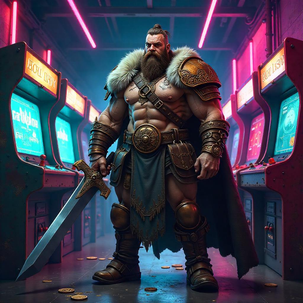 A high-detail digital art piece featuring a burly barbarian in a neon-lit arcade. He wears rugged furs and ornate bronze armor etched with runes, a colossal steel greatsword slung over his shoulder. The arcade is packed with glowing arcade cabinets, retro CRT screens displaying pixel art sprites, and pulsating neon tubes in pink, cyan, and violet. The polished floor reflects the vibrant lights as coins and prize tickets flutter around. The barbarian stands in a dynamic three-quarter pose, fierce yet curious gaze, with dramatic lighting, subtle motion blur on his cloak, and painterly textures throughout.
