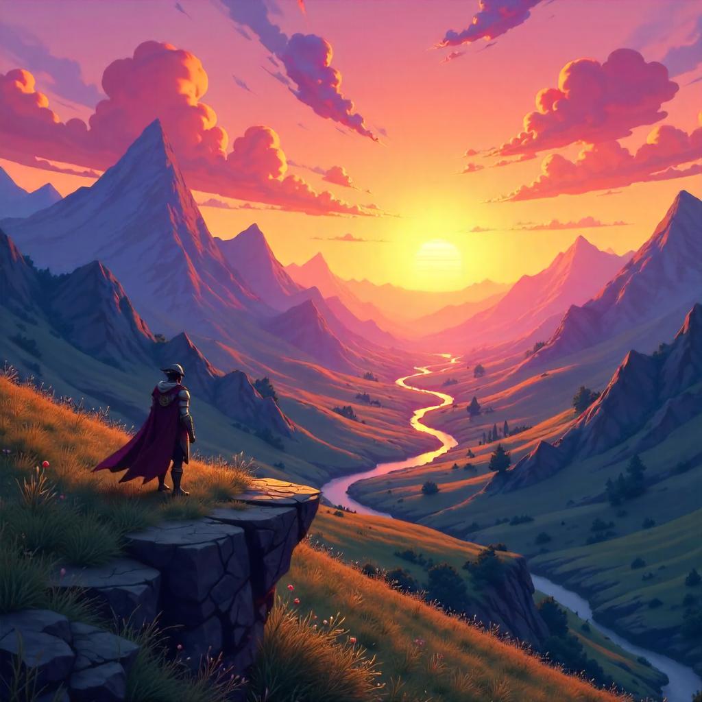 A sunrise scene rendered in painterly digital art for a fantasy RPG video game. A wide valley with softly rolling low-poly terrain and distant jagged mountains. The sun rises on the horizon, spilling warm golds, oranges, and pinks across a sky that shifts from deep purple to peach. Subtle atmospheric haze and bloom give a cinematic glow. In the mid-ground, stylized geometric trees and a winding river reflect the sunrise. A lone hero in light armor stands on a cliff edge, with dust motes and wind-blown grass adding life. Foreground reveals subtle game-ready details like distant settlement silhouettes and faint quest markers in the distance. The composition emphasizes depth, scale, and a cinematic camera angle suitable for in-game environments; use painterly brushwork, color-graded lighting, subtle depth of field, and gentle motion suggested by swaying grass.