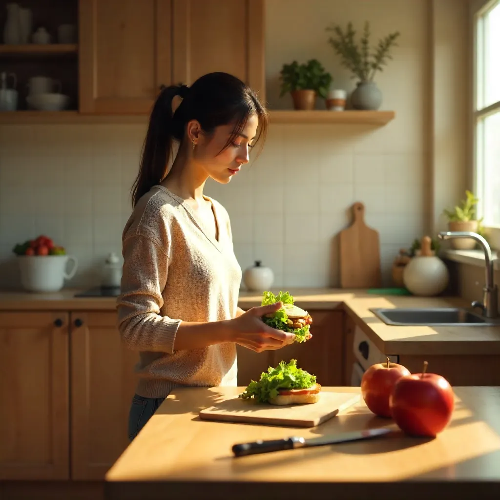 Photorealistic morning kitchen scene at breakfast time. An unrecognizable female figure stands at a wooden table. Her face is blurred or hidden to emphasize anonymity. She holds a sandwich with fresh lettuce in her hands. On the table lies a cutting board with a knife and a bunch of apples. Warm sunlight streams through a window, casting soft shadows across the scene. The kitchen features natural wood textures, soft tiles, and subtle details for a cozy, real-life look.