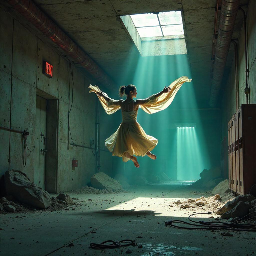 An evocative concept art scene of a dancer in a dim underground bunker. The dancer is mid-air in a powerful leap, fabric ribbons streaming from their sleeves, dust motes floating in shafts of pale light from a broken skylight and flickering neon panels. The bunker features cracked concrete walls, rusted pipes, and scattered lockers; cables snake along the floor. Mood: resilient, dystopian, hopeful. Style: cinematic concept art, matte painting, painterly textures, high-contrast lighting; color palette of desaturated grays and blues with electric green and magenta accents. Composition: dynamic diagonal from a low-angle perspective, long-exposure trails behind the dancer’s movement, shallow depth of field with the figure sharp and background softly blurred. Include subtle details: chalked dance notes on the wall, footprints in dust, a distant exit halo, a small emergency beacon glowing. The image should feel like a storyboard frame from a sci-fi/post-apocalyptic ballet, telling a story of endurance and grace in confinement.