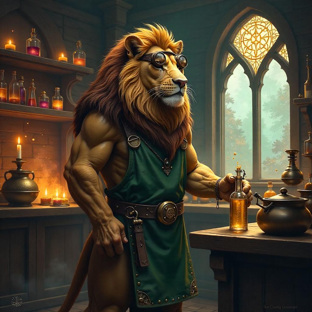 An heroic, highly detailed concept art scene: a regal lion standing upright as an alchemist in a fantasy potion shop. The lion wears a weathered leather apron and round arcane goggles, one paw resting on a glass potion bottle. The shop is warm and candlelit, shelves packed with bubbling potions in crystal vials, brass cauldrons simmering on a forge, and wisps of magical steam swirling through the air. Runes and sigils glow along wooden beams and stained-glass windows; dust motes drift in amber light. Rich textures: fur, leather, glass, metal. Cinematic composition with dramatic lighting, shallow depth of field, and a painterly digital-art style. Color palette of gold, emerald, amethyst, and teal. The scene conveys curiosity and magic in a bustling fantasy emporium.