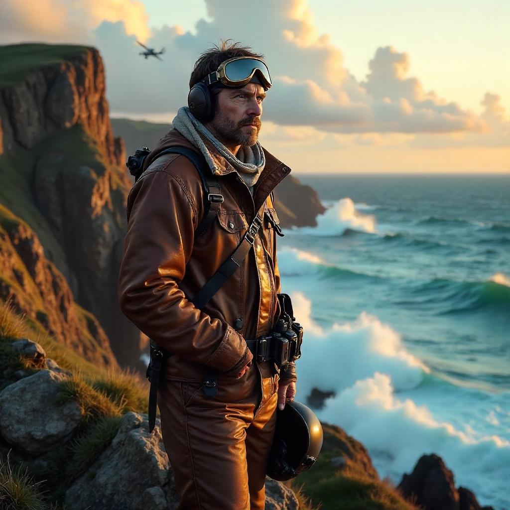 A photorealistic, cinematic portrait of a rugged pilot standing on the edge of a wind-swept coastal cliff at golden hour. The pilot wears a weathered brown leather flight jacket, brass aviator goggles pushed up on the helmet, and a scarf fluttering behind in the strong offshore wind, with a helmet tucked under one arm. Jagged rocks, salt spray, and a deep blue sea crash below while dramatic clouds glow with warm light. A distant, subtle silhouette of a vintage aircraft on the horizon adds context. The shot uses a low angle, wide lens feel, with ultra-detailed textures — leather, metal, rock, and mist — and a shallow depth of field to keep the pilot crisply in focus against a softly blurred seascape.