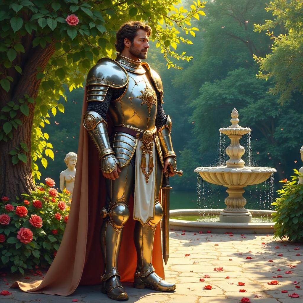 An noble paladin in ornate silver-and-gold armor stands in a sunlit garden, his gleaming shield bearing a sacred sigil and a sword sheathed at his side. His calm, devout gaze matches the dignity of his pose. Rendered in lush oil-on-canvas style with visible brushstrokes and gentle impasto, as if from a classical or Romantic master. The scene is bathed in golden-hour light; leaves scatter dappled patterns on a gravel path, a marble fountain murmurs softly, rose bushes are in full bloom, and ivy-clad statues watch over the scene. Rich greens, brass highlights, and touches of sapphire blue populate the palette, with a subtle celestial glow around the paladin that hints at divine favor. Compositionally, the paladin sits slightly off-center in a three-quarter view, with detailed armor textures, flowing cape, and delicate flora in the foreground, creating depth through atmospheric perspective and painterly glaze layers.
