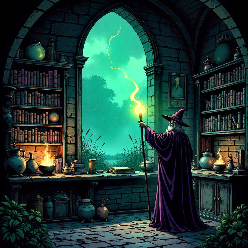 Inside a towering wizard's study, a cluttered chamber glows with bubbling cauldrons, floating crystal orbs, and shelves of spellbooks. A tall arched window reveals a misty marsh outside: reed-filled bogs, dark water, and silhouettes of gnarled trees under a moody sky. The scene is drawn in bold comic-book style with thick black ink outlines, high-contrast cel shading, and halftone textures. A robed mage raises a glowing staff, casting light that dances across the fog and marsh, while dramatic action lines and panel-like composition convey motion. Rich jewel tones—emeralds, purples, and midnight blues—give the scene a magical, cinematic feel.