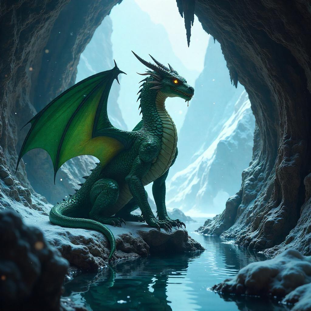 Photorealistic wyvern inside a jagged mountain cave. The two-legged dragon-like creature sits on a slick rock ledge, wings folded along its back, long tail curling around a stalagmite. Emerald-green scales with a metallic sheen and faint black runes along the spine. Glowing amber eyes, sharp horns, and serrated teeth. Cold blue light pours from snow-filtered shafts overhead, creating volumetric rays and dust motes. The cave walls are rough and wet with mineral moisture; stalactites hang from the ceiling, stalagmites rise from the floor; a narrow underground pool reflects the wyvern's looming silhouette. Mist swirls around its snout as it exhales a warm breath. Subtle reflections shimmer on the water; the air is chilly with hints of earth and sulfur. The scene is shot with a cinematic lens, 50-85mm focal length, shallow depth of field, ultra-detailed scales, claws, and wing membranes; color palette cool blues and grays with contrasting warm gold from eye glow and breath; dramatic soft lighting, high realism.