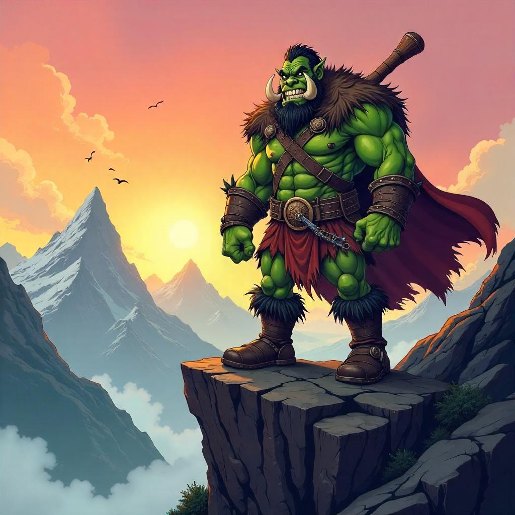Cartoon-style orc stands proudly on a jagged rocky outcrop, bold black outlines, chunky green-skinned figure with oversized tusks and a mischievous grin. Wearing tattered brown leather armor and a fur cloak fluttering in the wind. The cliff edge overlooks a misty valley with distant cartoon mountains; windy atmosphere with clouds and birds. Low-angle perspective to emphasize heroism. Soft cel-shading, bright, saturated colors; warm sunset light casting long shadows, orange-pink sky. Add a wooden club strapped to his back for character.