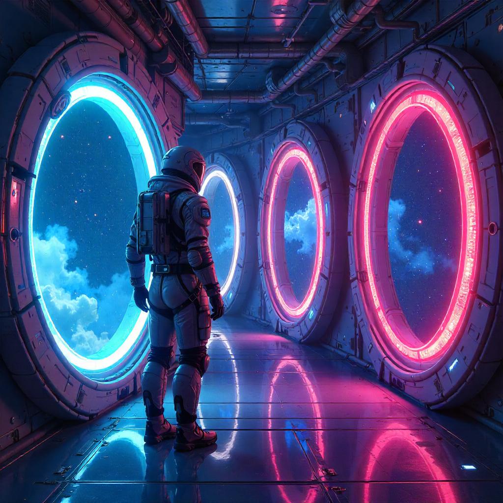 An intrepid pilot in a high-tech portal lab. This digital painting features a sleek flight suit with glowing trim, a reflective visor, and a compact helmet tucked under the arm. The pilot stands before a row of luminous portal gateways—rings of energy in varying sizes, shimmering with neon blues, cyans, and pinks. The lab is filled with glass tubes, holographic displays, and chrome consoles that reflect the portals’ glow. Nebulae appear within the portals like windows to space, with starfields swirling beyond. The scene is rendered in vibrant digital art style with crisp lines, bold gradients, and cinematic lighting; neon reflections dance on metal surfaces, with subtle particle dust and lens flares to boost the sci-fi mood. Pose: the pilot reaches toward a portal with one hand, suggesting calibration or readiness to step through. Optional details: a mission patch on the suit, a small drone hovering nearby. Overall mood: awe-inspiring, adventurous, futuristic.