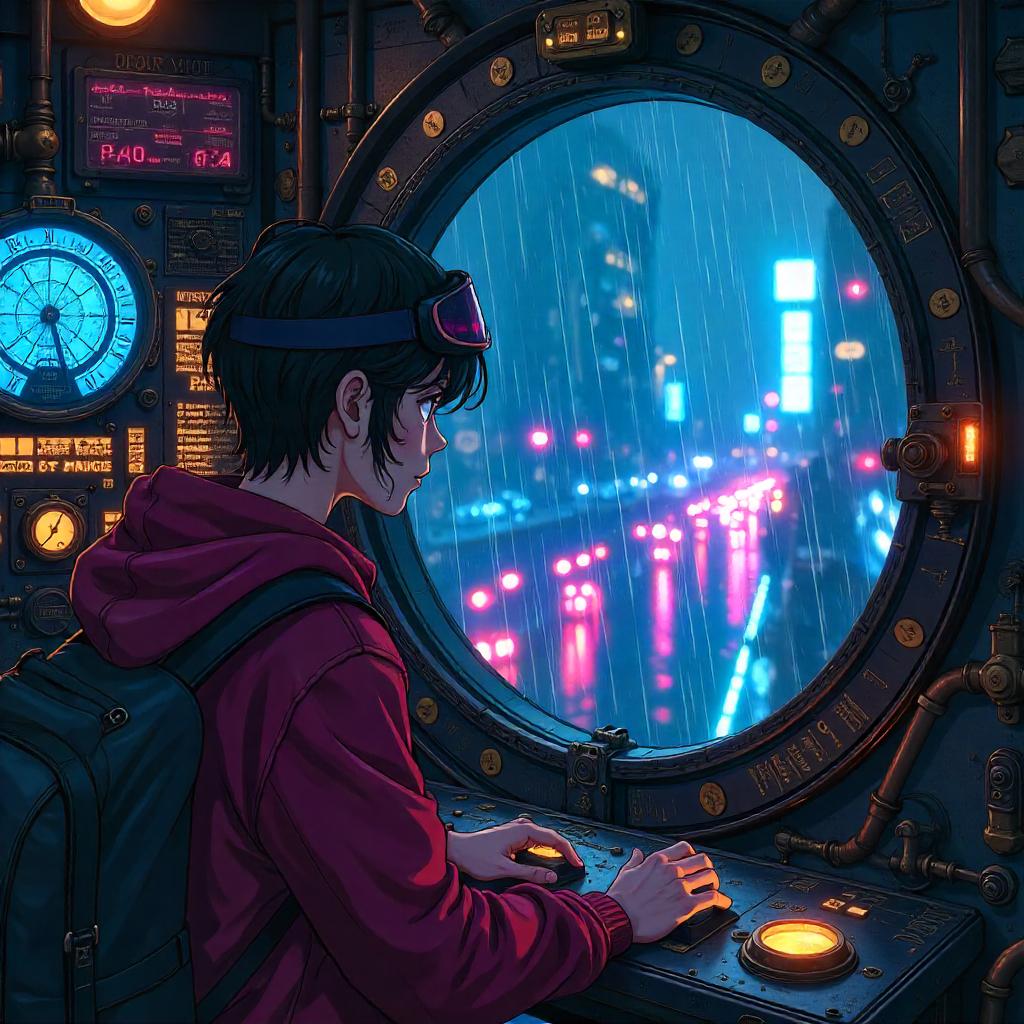 Inside a time machine cockpit, an anime-style scene during a heavy rainstorm. A young traveler with wet hair and goggles operates glowing holographic dials; brass levers, copper pipes, gears, and arcane runes fill the control panel. The window reveals torrential rain outside and a neon-lit city blurred past. Reflections of blue and magenta neon splash across rain-spattered glass and wet surfaces. The time portal hums with magical energy as clockwork gears turn, hinting at a jump through time. The art style is crisp anime with cel shading, high detail, dynamic composition, and cinematic lighting.