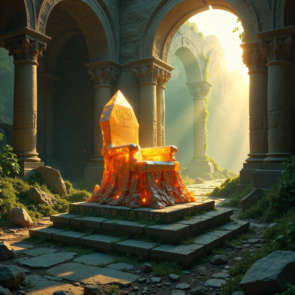 Ultra-detailed photorealistic scene of a crystal throne in the heart of ancient ruins. A translucent, multifaceted crystal throne sits on a weathered stone dais, its facets catching and refracting amber and emerald light. The ruined temple is overgrown with moss and ivy; broken columns, cracked arches, and toppled statues frame the throne. Warm golden-hour light filters through gaps in the ceiling, scattering prism-like highlights across floating dust motes and the crystal’s surfaces. Runes etched along the throne’s base glow faintly with a blue-white hue, hinting at lost power. Ground strewn with rubble and stone fragments; damp air glints with micro-reflections. Camera angle is a cinematic wide shot at eye level with shallow depth of field, keeping the throne in crisp focus while the ravaged ruins fade softly in the background. Textural cues: hyperreal glassy crystal, frosted edges, weathered stone, mossy greens, etched glyphs, subtle rain-like particles, and atmospheric haze. 8K, hyper-detailed, ultra-realistic lighting.