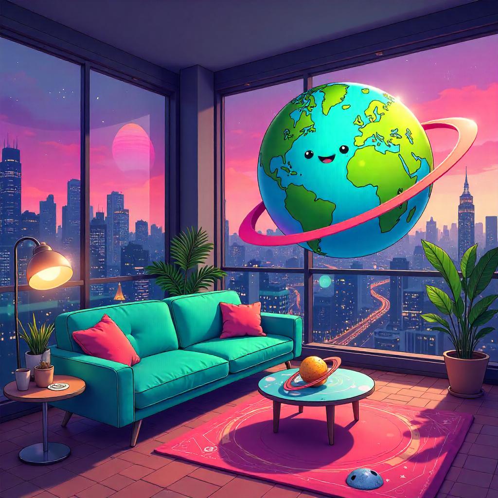 Cartoon-style planet perched in a luxurious penthouse living room. A plump, smiling globe with bright blue and green continents and a friendly face orbits a tiny satellite toy. The penthouse features floor-to-ceiling windows with a panoramic neon cityscape at dusk, pink and purple skies, and distant flying cars. Inside, retro-futuristic furniture meets cozy modern design: a curved velvet teal sofa, a glass coffee table with a mini solar-system model, a round galaxy-pattern rug, potted plants, a floating bookshelf, and a chrome lamp. Warm sunlight pours in alongside a subtle glow from the planet itself, creating bold, saturated colors with thick cartoon outlines. The overall vibe is playful, whimsical, and futuristic, suitable for a lighthearted animated illustration.