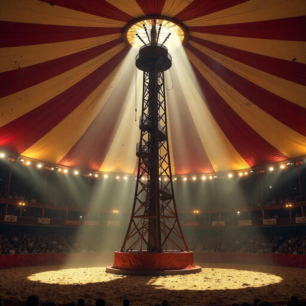 Photorealistic scene of a tall, sleek steel tower standing in the center of a grand circus tent. The Big Top is a red-and-white striped canopy with a circular arena floor covered in sawdust and lined by velvet seats. Dramatic spotlights sweep across the tower, casting crisp highlights and long shadows. The tower has a lattice steel frame, exterior stairs, and a small observation cabin at the top. Warm amber lighting and faint dust motes fill the air, with banners and ropes hanging from the canopy and curious spectators in the stands. The juxtaposition of brutal industrial architecture and whimsical circus atmosphere creates a surreal, cinematic mood.
