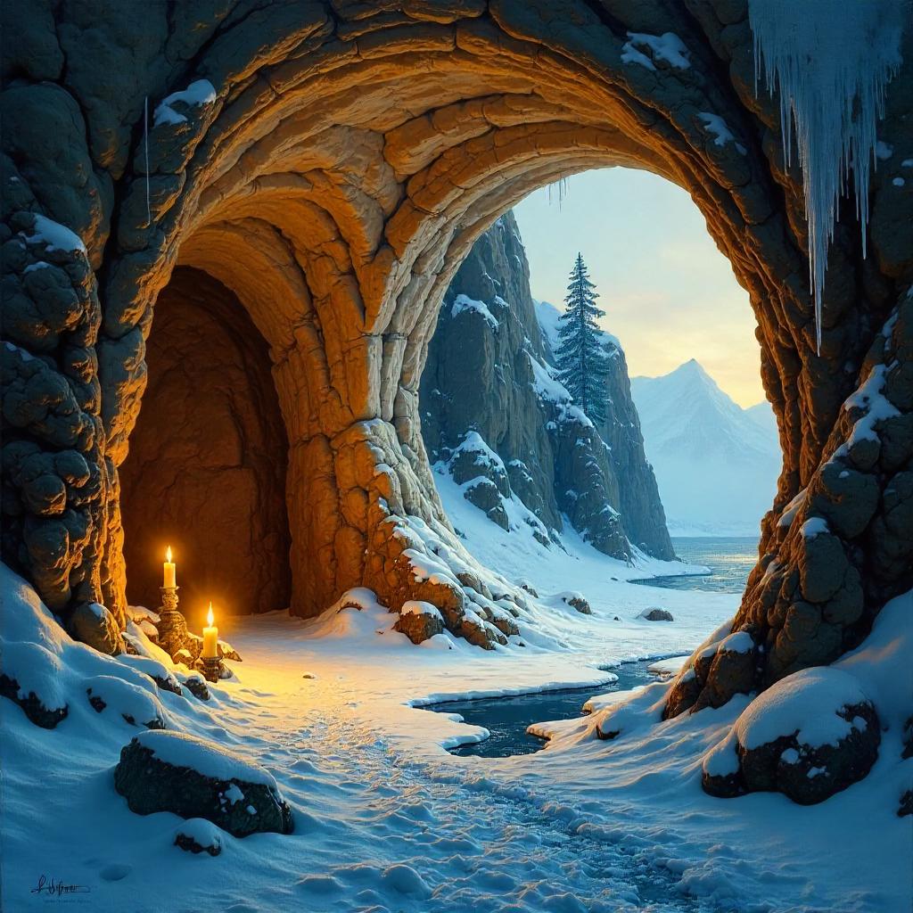 Inside an ice igloo, a hidden cavern carved from snow and stone opens beyond a translucent dome. The igloo’s ice blocks form a curved ceiling, while candles or a single oil lamp cast a warm amber glow on rough cave walls, wet rock, and mineral veins. Thick oil-paint brushstrokes render the scene in rich ochre, umber, and blues with dramatic chiaroscuro and impasto texture. Icicles hang like chandeliers from the cave ceiling, a shallow meltwater pool reflects the flickering light, and a deep passage awaits in soft focus. The composition blends surreal fantasy with classic oil-painting realism, capturing both icy stillness and earthy warmth in a dreamlike mood.