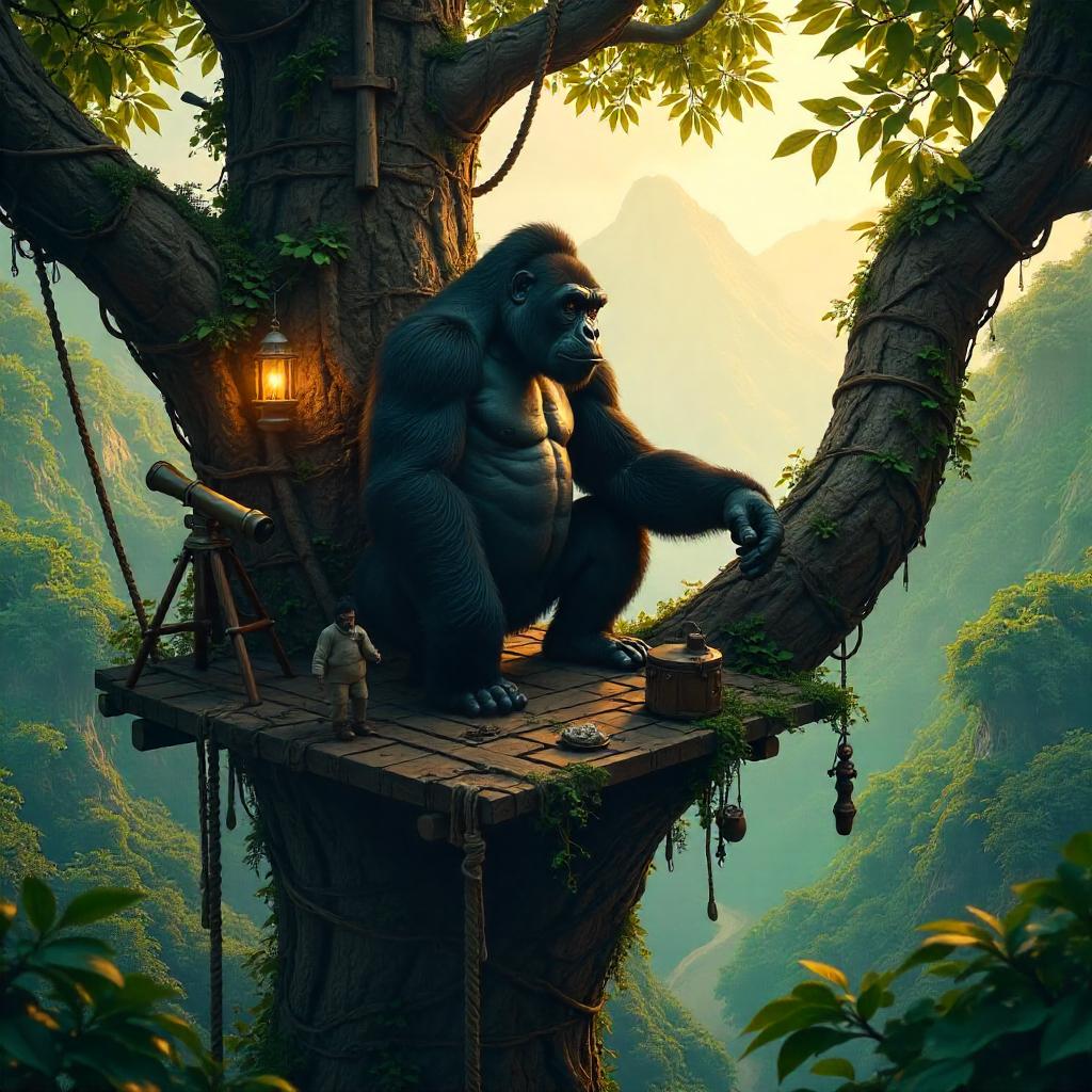 Ultra-detailed concept art of a regal adult gorilla perched inside a sprawling tree house high in a tropical rainforest. The wooden platforms, rope ladders, and vine-wrapped beams weave among thick branches. Warm golden-hour light filters through the emerald canopy, illuminating the gorilla's textured fur and the weathered wood. Cinematic, painterly realism with high contrast, depth of field, and a fantasy-meets-inventive-tech aesthetic. Include a telescope, carved totems, and hanging lanterns to suggest a lived-in, imaginative habitat.