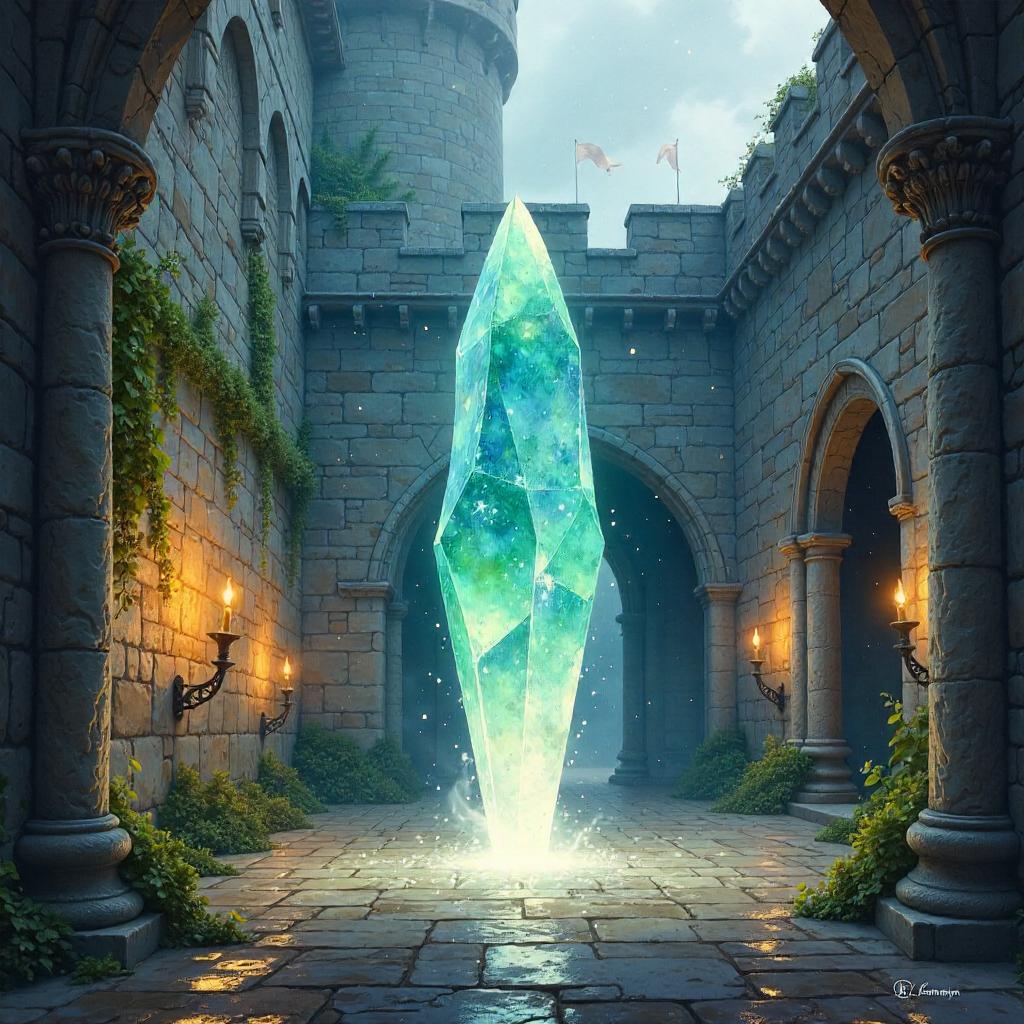 An ethereal crystal entity suspended in a grand medieval fortress courtyard, painted in watercolor with soft washes and subtle color bleed. The entity is humanoid or amorphous, formed from translucent crystal facets that refract light into pale blues, greens, and lilacs. It glows gently, casting tiny prisms across damp stone walls. Surrounding fortress features ancient stonework, towering crenellations, ivy, torches or lanterns, arched doorways, and fluttering banners. Damp moss, mist, and warm amber torchlight contrast with the cool crystal glow. The scene has a dreamlike, tranquil mood with delicate textures and painterly edges typical of watercolor. A light rain or mist enhances translucency and the interplay of luminous crystal against rough stone, focusing on reflections and refractions across surfaces.