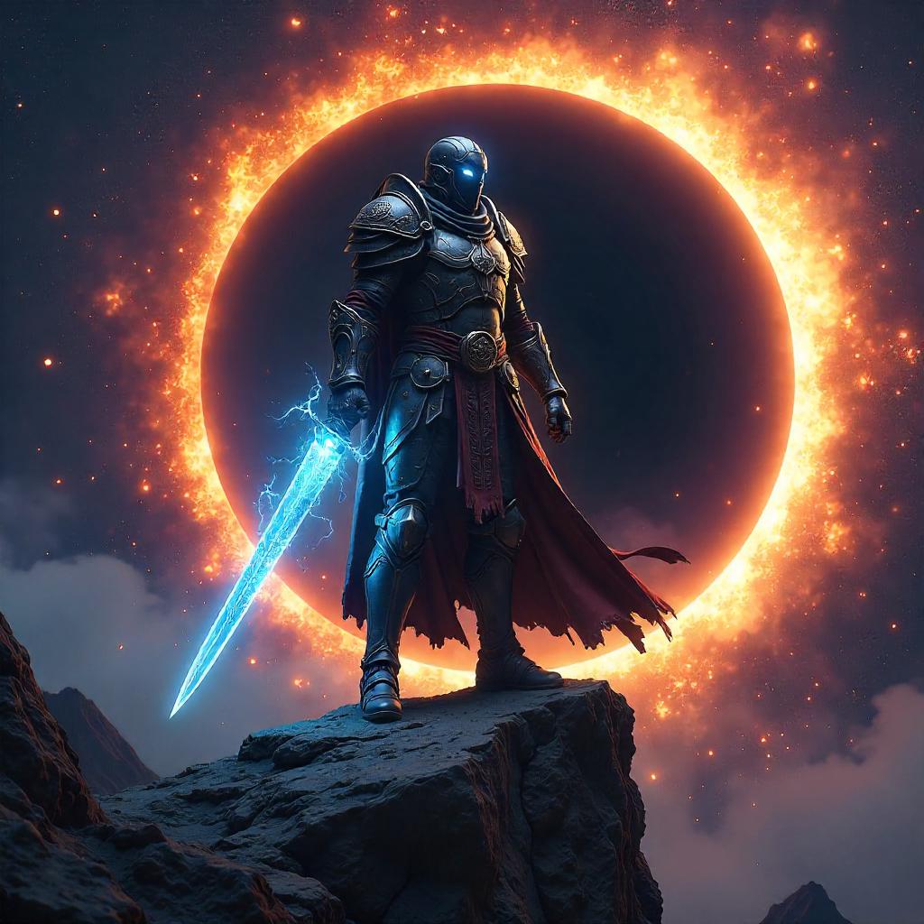 Hyper-detailed concept art of a battle-worn warrior floating within a black hole. The armored figure wears ornate, rune-etched plating, a tattered cape, and a plasma energy blade crackling with blue light. The scene unfolds inside the event horizon with an accretion disk ablaze in orange and violet, gravitational lensing bending stars into arcs and cosmic winds ripping at space-time. The warrior stands on a jagged rock, eyes glowing with resolve as energy tethers hum around the armor. Dramatic rim lighting from the disk, high contrast, ultra-high detail, cinematic perspective. Style: dark fantasy space art with painterly textures and subtle photoreal hints, 4K.