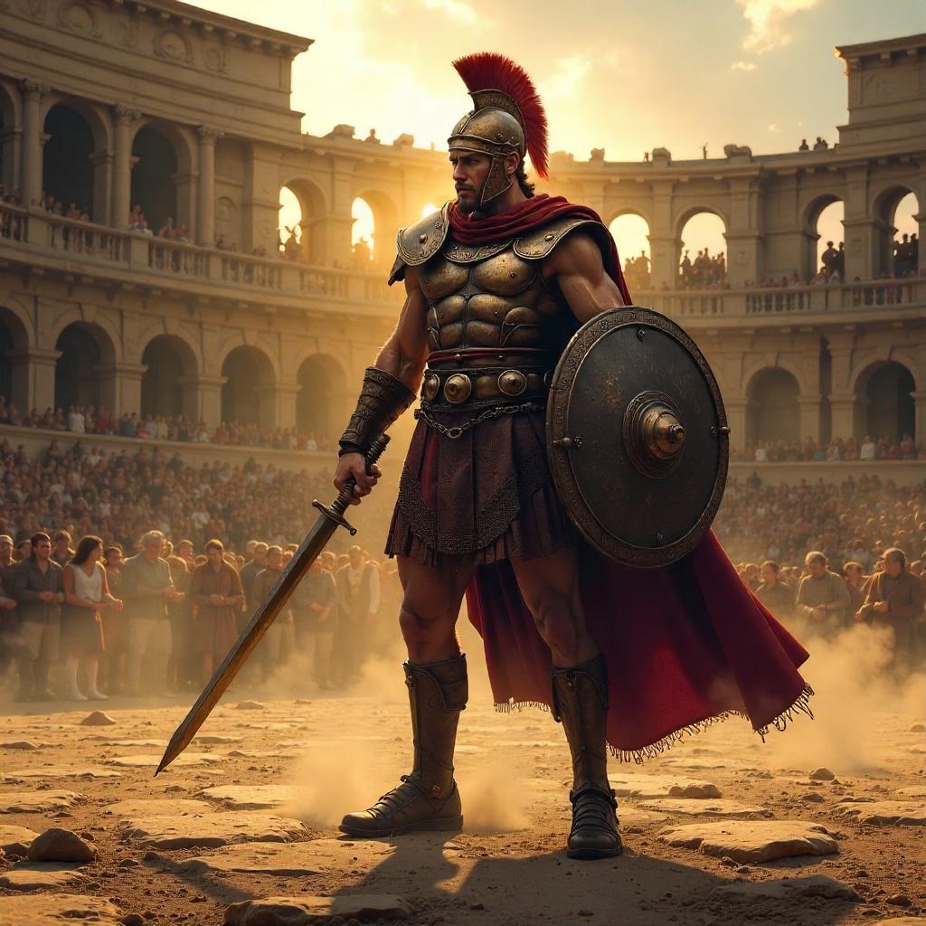 A dawn-lit gladiator stands in a dusty Roman amphitheater, concept art, ultra-detailed digital painting. The armored fighter wears a battered bronze helmet with a red plume, weathered leather cuirass, chainmail skirt, and a cloak. He grips a gladius in one hand and a round shield in the other; his stance is confident, battle-scarred, eyes blazing with resolve. Sunrise pours through the arches, casting warm amber light, long shadows across sun-bleached stones, dust motes glowing in the rays. The scene includes distant arches, faint silhouettes of cheering crowds, and a subtle glow halo around the figure. Style: cinematic, high-detail, painterly textures, realistic lighting, depth of field with a shallow focus on the gladiator. Color palette: sunrise oranges, golds, pinks with blue-gray shadows. Rendered as dynamic concept art for a fantasy-historical scene.