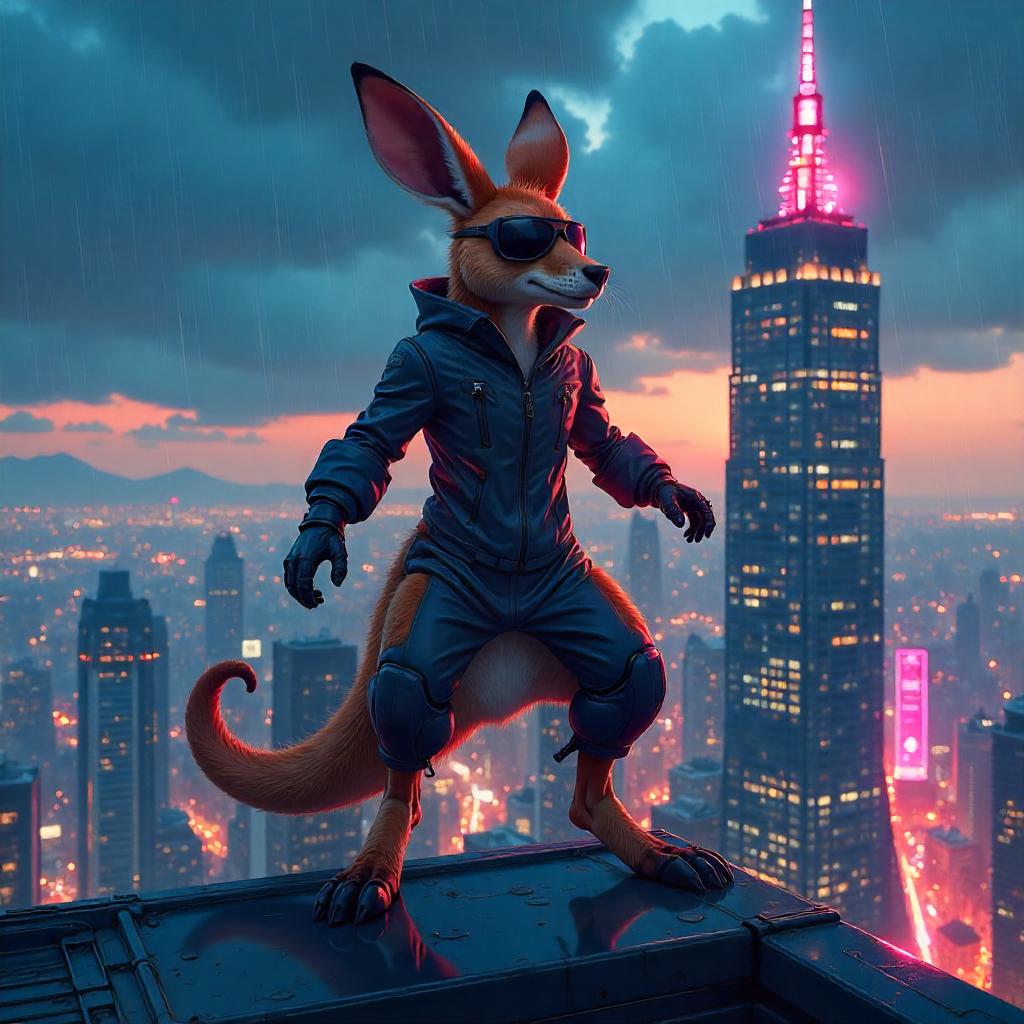 An energetic kangaroo in anime style wearing a sleek futuristic suit and visor, standing on the glassy rooftop edge of a towering skyscraper at dusk. Neon city lights reflect off rain-slick windows, casting vibrant colors across the scene. A dynamic low-angle shot emphasizes the kangaroo's confident pose and wind-swept fur, with a sprawling cyberpunk cityscape of glowing towers and holographic ads in the background. Crisp cel-shaded line art, high detail, cinematic lighting.
