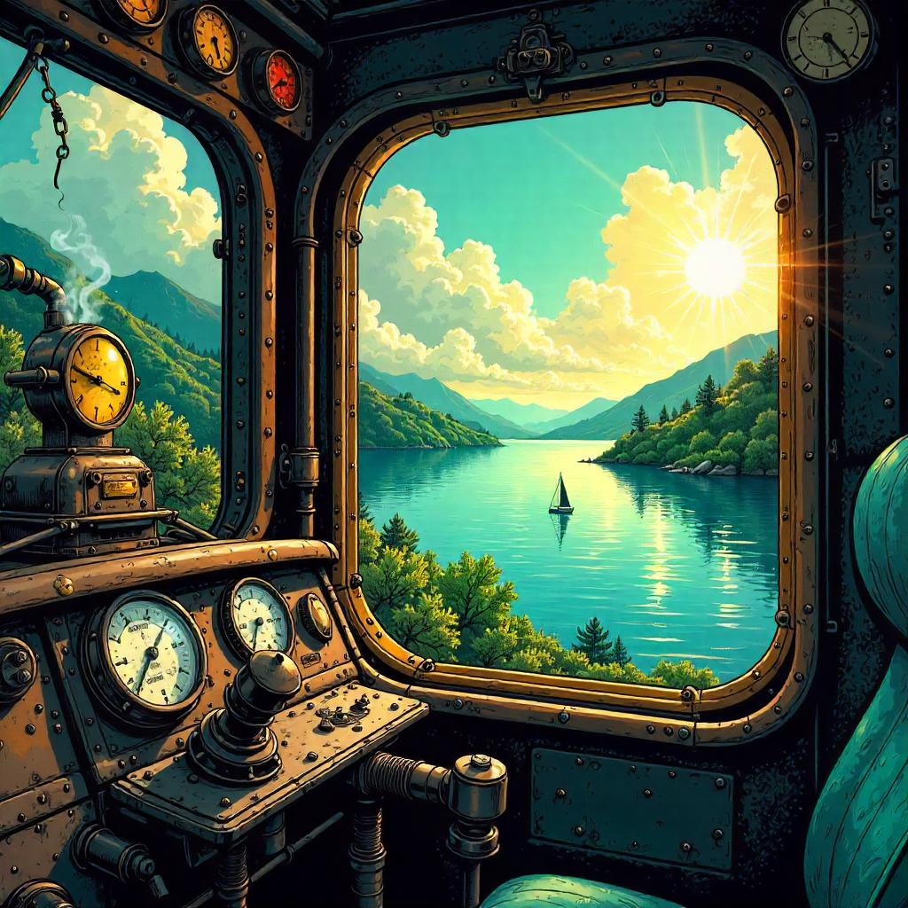 Inside the brass-and-steel cab of a vintage steam locomotive, a serene lake scene unfolds through a riveted window. This comic-book style illustration uses bold black ink lines, dynamic angles, and halftone shading. In the foreground, gauges, levers, pipes, and a puff of steam add to the locomotive atmosphere. Outside, a tranquil lake reflects a dramatic sky, with distant hills and a small sailboat. Use a high-contrast color palette: cobalt blues, coppery brass, steel grays, and emerald water. Lighting is cinematic: strong sun rays piercing through clouds, long shadows on metal, and motion hints from speed lines suggesting the train is in motion. The composition should feel like a panel from a graphic novel, with crisp edges and textured shading.