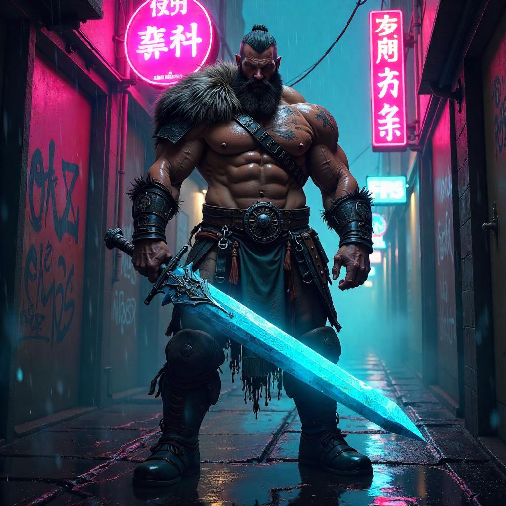 Ultra-detailed concept art of a barbarian standing in a neon-lit alley at night. A towering warrior with a torn fur cloak, rugged muscles, and battlefield scars. He grips a massive, rune-etched greatsword that glows with blue-hot energy. The alley is narrow and rain-slick, reflecting electric pink, cyan, and violet neon signs with foreign scripts and holographic graffiti. Steam vents puff in the background. The barbarian’s armor blends primitive fur with cyberpunk flair: LED-lit bracers, a reinforced shoulder guard with engravings, and dangling tassels. The mood is gritty and cinematic, with strong rim lighting and deep shadows. Dynamic low-angle composition emphasizes his power, with a shallow depth of field to blur distant neon. Emphasize textures: leather, metal, wet surfaces, and raindrops. Color palette dominated by electric blues, magenta-pinks, and neon cyan, with warm skin tones. Style: dark fantasy meets cyberpunk concept art, painterly digital painting, high-detail, film-grain finish.