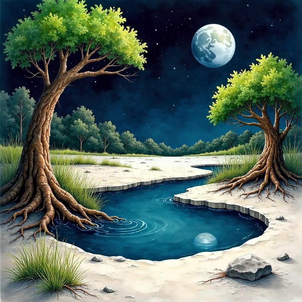 A dreamlike watercolor scene: a swamp on the Moon. Pale lunar plains beneath, with a shallow glassy pond reflecting the blue-white Earth. Surrounding the pond are tangled swamp reeds and gnarly trees with exposed roots, rendered in dark greens and rusty browns. Mist drifts over the water and soft lunar dust creates color bleeds. The sky is inky black with distant stars; Earth appears on the horizon. Use loose wet-on-wet watercolor washes, soft edges, and textured paper to evoke a surreal, otherworldly marsh.