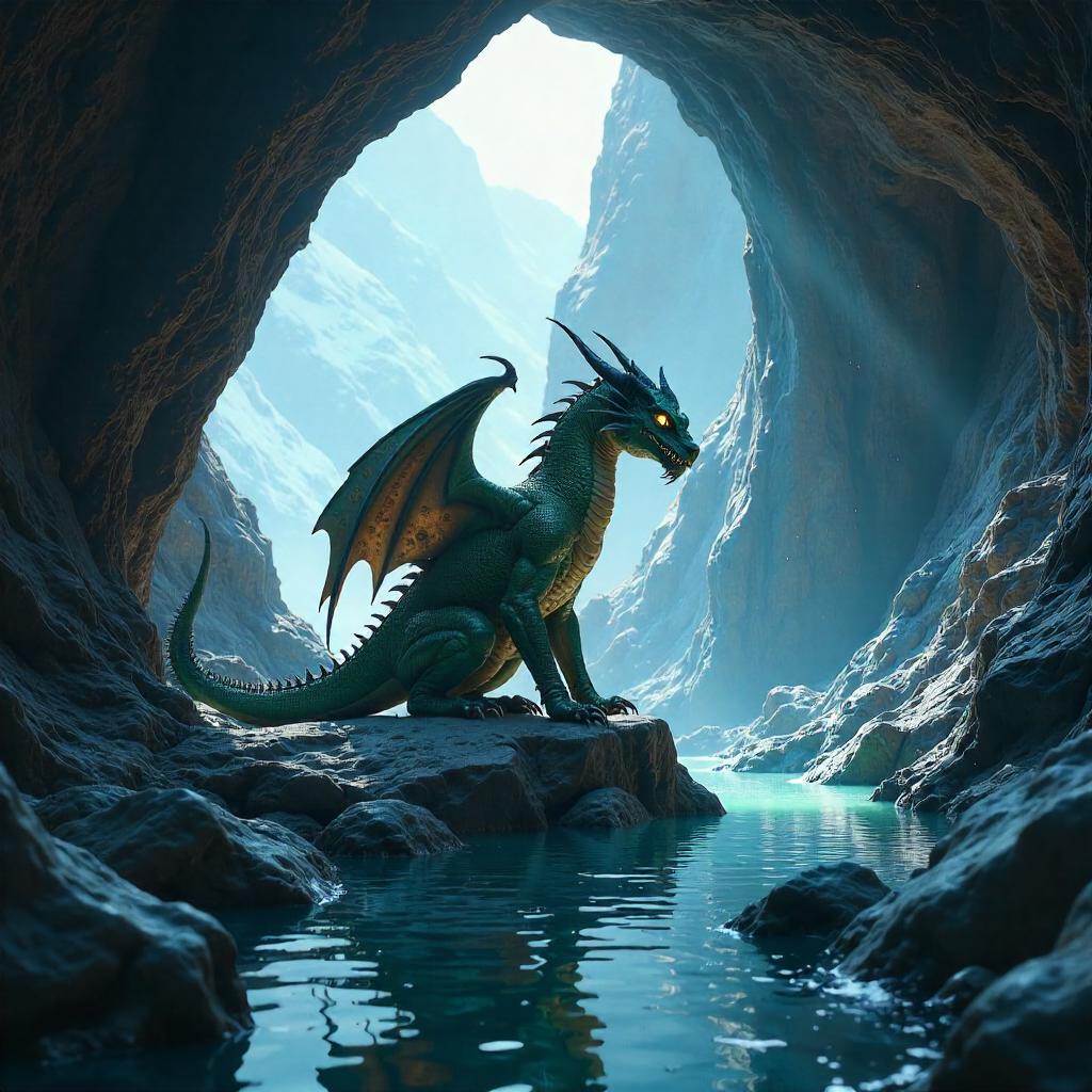 Photorealistic wyvern inside a jagged mountain cave. The two-legged dragon-like creature sits on a slick rock ledge, wings folded along its back, long tail curling around a stalagmite. Emerald-green scales with a metallic sheen and faint black runes along the spine. Glowing amber eyes, sharp horns, and serrated teeth. Cold blue light pours from snow-filtered shafts overhead, creating volumetric rays and dust motes. The cave walls are rough and wet with mineral moisture; stalactites hang from the ceiling, stalagmites rise from the floor; a narrow underground pool reflects the wyvern's looming silhouette. Mist swirls around its snout as it exhales a warm breath. Subtle reflections shimmer on the water; the air is chilly with hints of earth and sulfur. The scene is shot with a cinematic lens, 50-85mm focal length, shallow depth of field, ultra-detailed scales, claws, and wing membranes; color palette cool blues and grays with contrasting warm gold from eye glow and breath; dramatic soft lighting, high realism.
