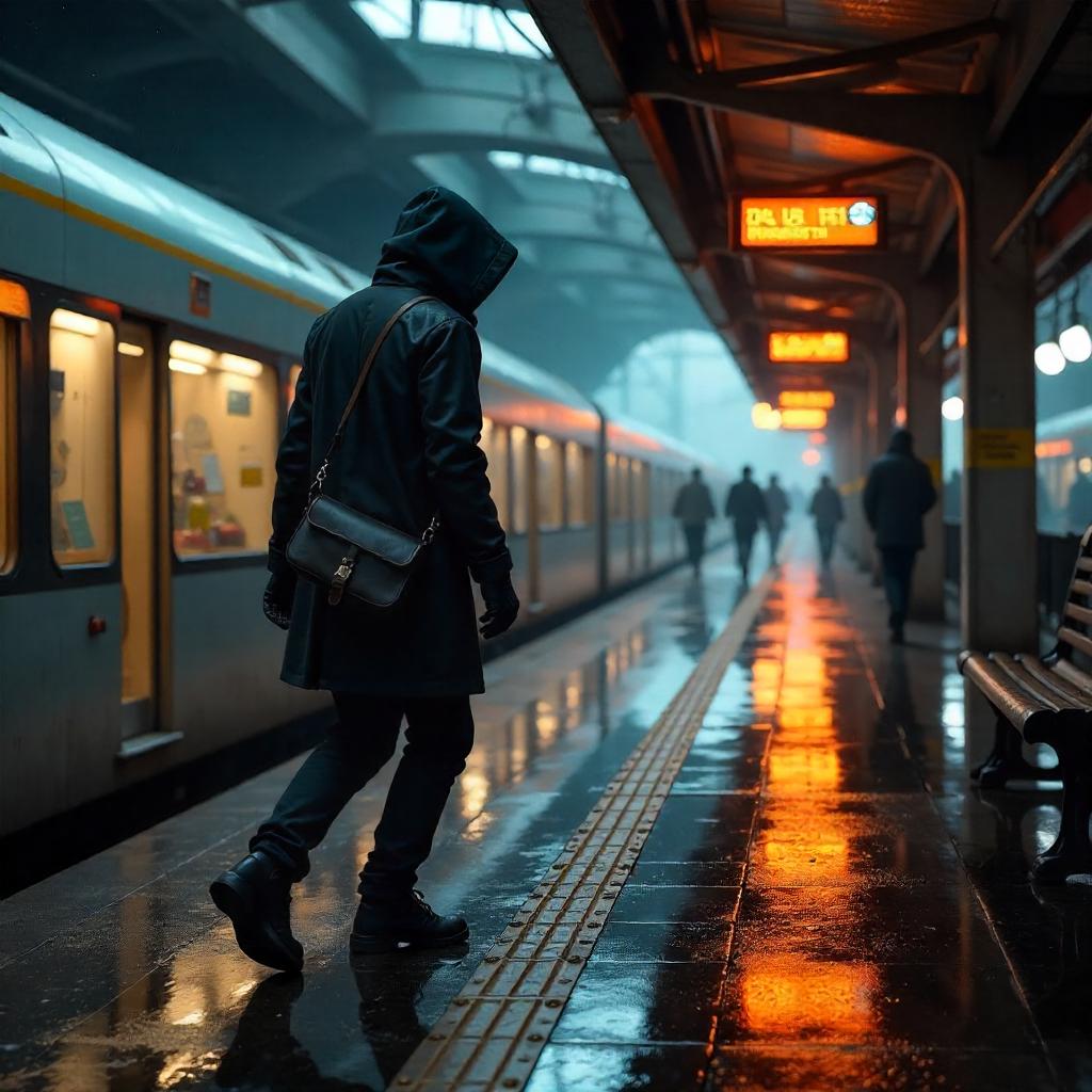 Hyper-detailed photorealistic 3D render of a thief in a bustling urban train station. The thief is a lean figure in a dark hooded coat, black gloves, and sneakers, slipping along a rain-slick platform with a small crossbody bag. A sleek modern train is just arriving, its windows showing motion blur as passengers bustle in the background. The station blends glass, steel, and neon signage, with warm amber platform lights and cool blue neon reflections. Wet surfaces create realistic reflections on polished benches, ticket booths, and railings. Dust motes drift in the beam of overhead lamps; the air has a slight haze from a distant steam vent. Depth of field focuses on the thief, the crowd behind them softly blurred. Cinematic noir mood with a desaturated palette accented by subtle orange highlights. Render uses PBR materials, global illumination, volumetric lighting, and mild motion blur to convey imminent action without explicit violence. Camera at waist level, slightly angled, catching a glancing over-the-shoulder expression that conveys tension.